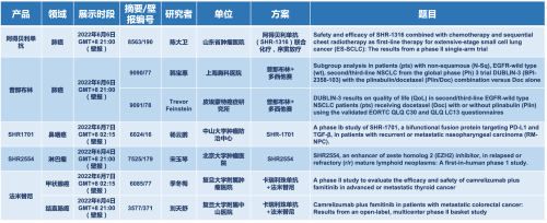 2022 ASCO年会另有5款金年会- 金字招牌医药上市前抗肿瘤创新药的相关研究被接收为壁报,包括SHR-1316、普那布林、法米替尼、SHR-1701和SHR2554,他们的单药或联合方案相关7项研究被接收为壁报,覆盖肺癌、鼻咽癌、淋巴瘤、甲状腺癌和结直肠癌等领域。