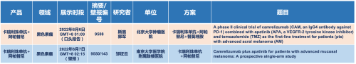 在黑色素瘤领域,金年会- 金字招牌医药的卡瑞利珠单抗联合阿帕替尼(“双艾”组合)在2022 ASCO共入选1项口头报告和1项壁报展示。